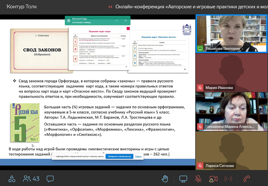 Коллеги из Красноярской краевой детской библиотеки – заместитель директора по основной деятельности Виктория Викторовна Тишакова и ведущий методист Анна Владимировна Андреева – рассказали о многогранном проекте «Сами с усами», который включает подкаст, настольную игру и другие активности. Участники конференции с интересом слушали презентацию коллег, о том, как сделать изучение русского языка увлекательным и приятным занятием.
