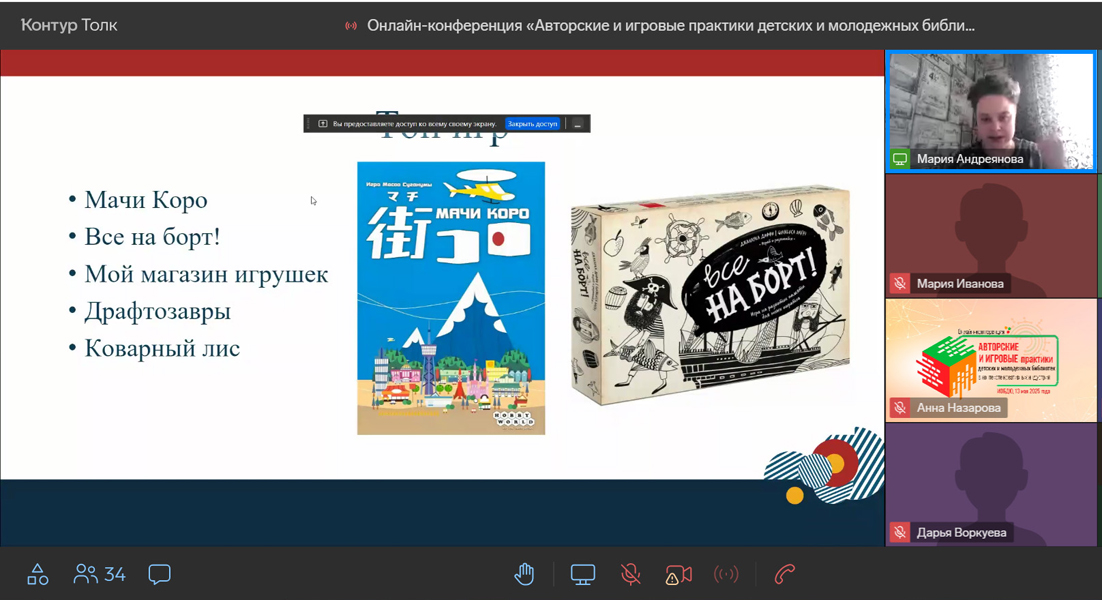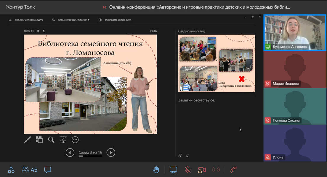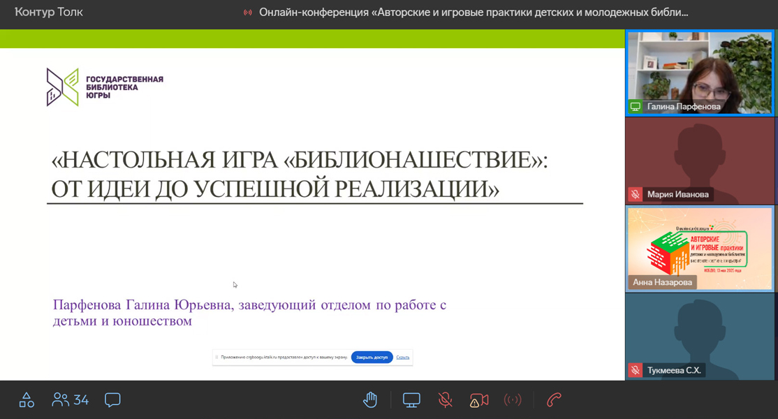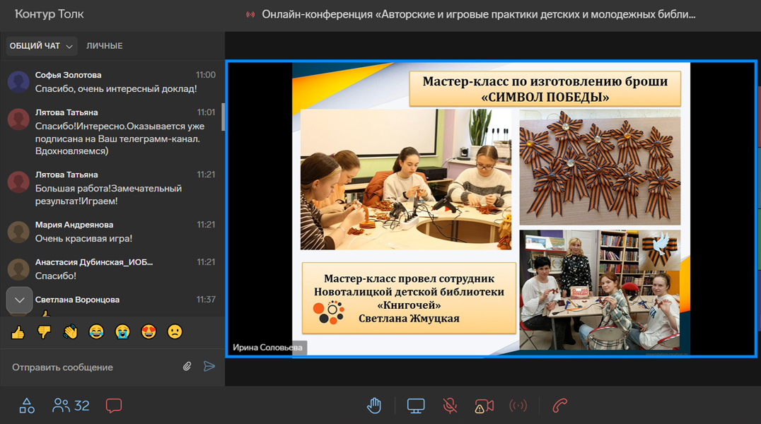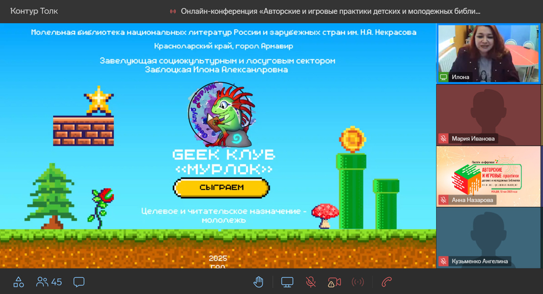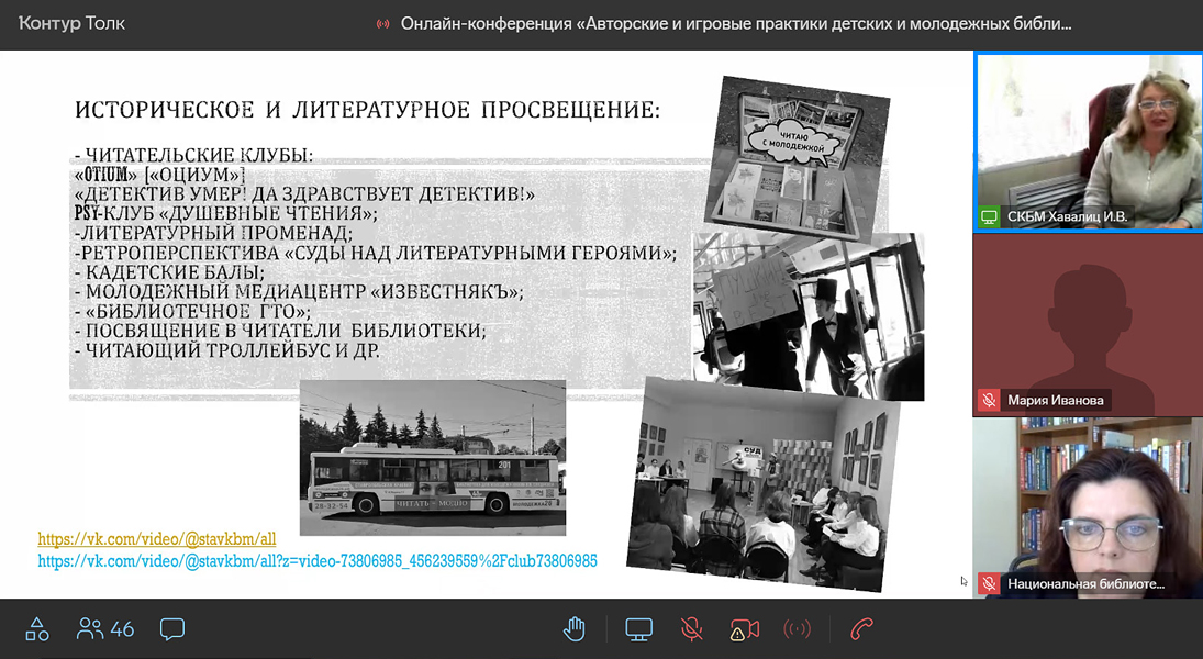 13 мая 2025 года Ивановская областная библиотека для детей и юношества провела на интернет-платформе «Контур.Толк» онлайн-конференцию «Авторские и игровые практики детских и молодежных библиотек в контексте креативных индустрий». Профессиональное мероприятие было приурочено к 30-летию объединения двух областных библиотек – детской и юношеской, в результате которого была создана Ивановская областная библиотека для детей и юношества.
