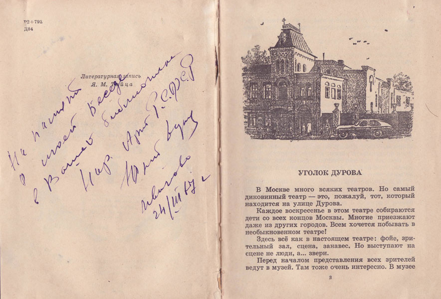 - Дурова, Н.Ю. Арена : повесть и рассказы / Наталья Юрьевна Дурова. – М. : Мол. гвардия, 1965. – 238 с. – [Автограф Ю.В. Дурова].