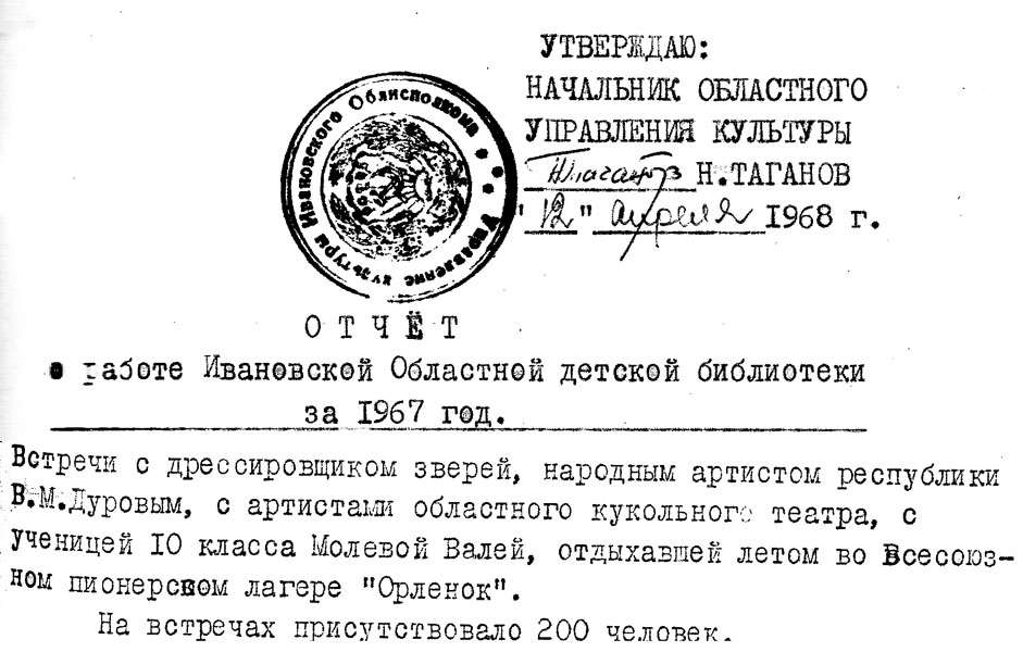 Более того, в 1960-х годах одним из ведущих учреждений культуры города Иванова был именно цирк. Не случайно, среди гостей областной детской библиотеки в этот период было немало знаменитых артистов цирка.