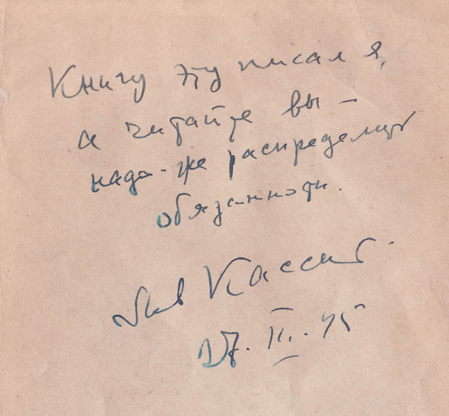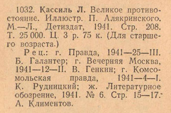 - Кассиль, Л. Великое противостояние / Лев Кассиль. – М. : Дет. лит., 1941. – 208 с. – [Автограф автора].