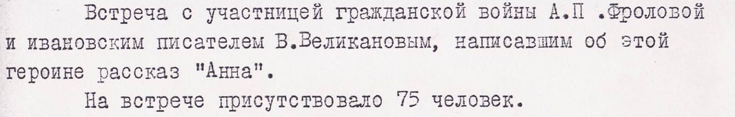 В архиве нашей библиотеки нам удалось разыскать только одну запись в отчете за 1967 год о читательской конференции, посвященной очерку Великанова «Анна».