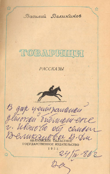 - Великанов, В.Д. Повесть об укротителе / Василий Дмитриевич Великанов ; ил. Ф.Н. Кулагин. – Иваново : Ивановск. кн. изд-во, 1957. – 257 с. : ил. – [Автограф автора].
