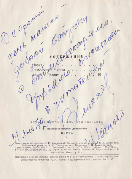 - Великанов, В.Д. Норка : рассказы / Василий Дмитриевич Великанов ; худож. Е. Симкин. – СПб. : Дет. лит., 1954. – 63 с. : ил. – [Автограф автора].