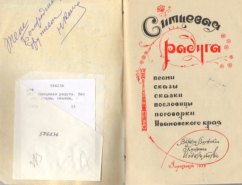 - Ситцевая радуга : песни, сказы, пословицы, поговорки Ивановского края. – Ярославль : Верхне-Волжское книжное издательство, 1972. – 96 с.