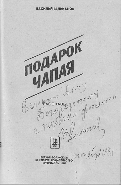 - Великанов, В.Д. Подарок Чапая : рассказы для детей младшего школьного возраста / В.Д. Великанов. – Ярославль : Верхне-Волжское книжное издательство, 1981. – 96 с. : ил.