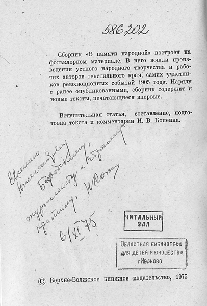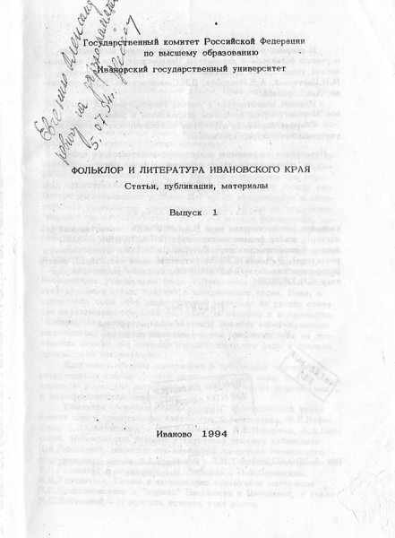 - Фольклор и литература Ивановского края : статьи, публикации, материалы. Вып.1 / редкол. В. Смирнов и др. – Иваново : Ивановский гос. ун-т, 1984. – 142 с.