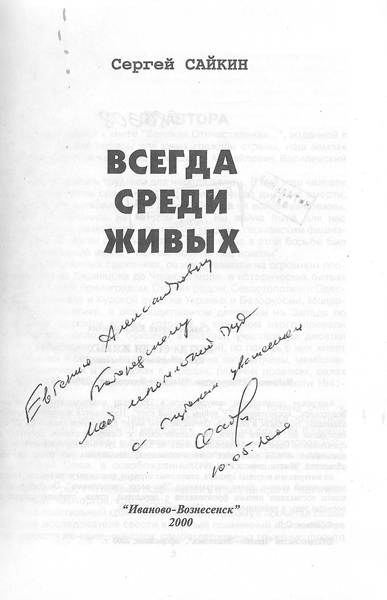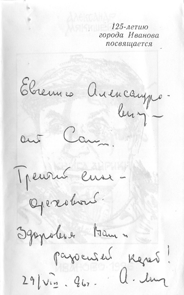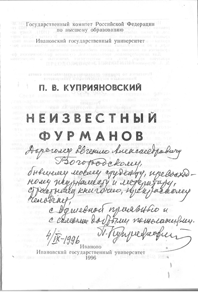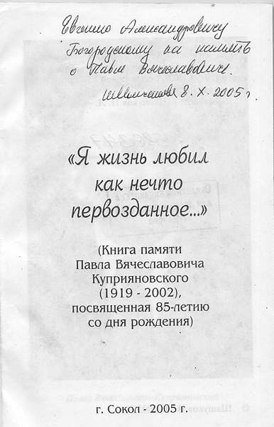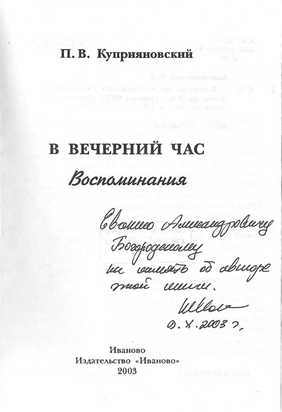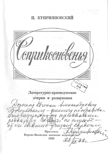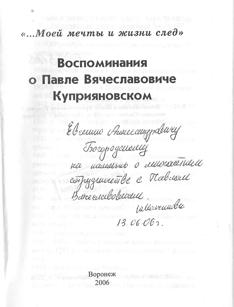 Подтверждением этих строк являются дарственные надписи, оставленные на страницах книг П.А. Куприяновского и на книге воспоминаний современников о самом Куприяновском.