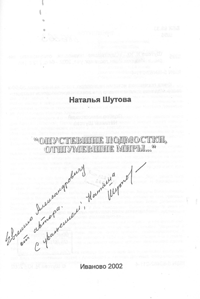 - Шутова, Н.Ю. «Опустевшие подмостки, отшумевшие миры…» / Н.Ю. Шутова. – Иваново : Ивановский гос. ун-т, 2002. – 64 с. : ил.