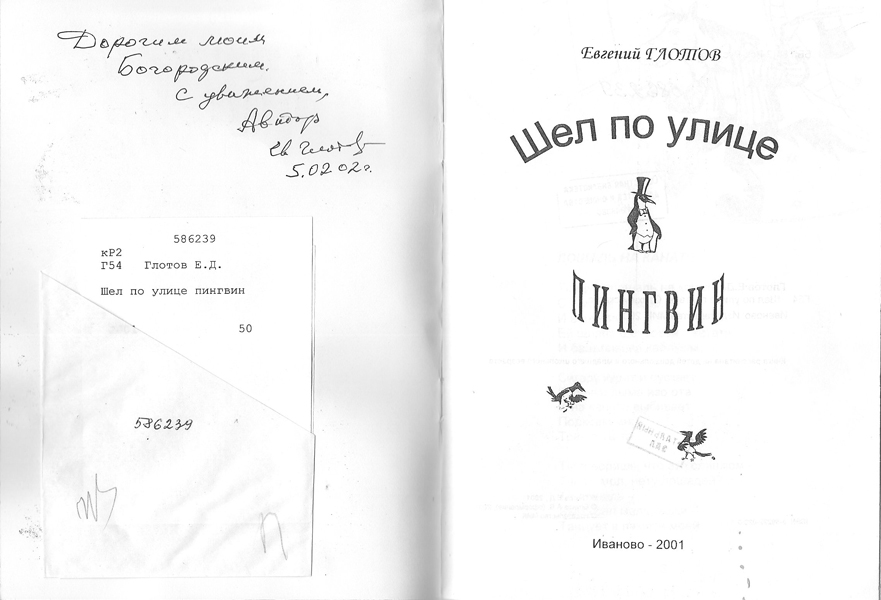 - Глотов, Е.Д. Шел по улице пингвин : стихи и сказка / Е.Д. Глотов. – Иваново : МИК, 2001. – 40 с.