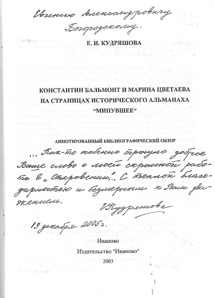 - Кудряшова, Е.И. Константин Бальмонт и Марина Цветаева на страницах исторического альманаха «Минувшее» : аналитический библиографический обзор / Е.И. Кудряшова. – Иваново : Иваново, 2003. – 52 с.