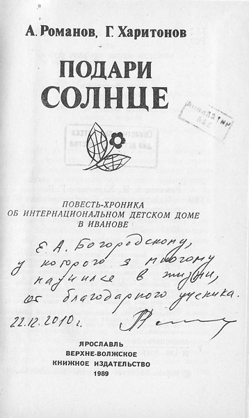 - Романов, А.И. Подари солнце : повесть-хроника об интернациональном детском доме в Иванове / А.И. Романов, Г.В. Харитонов. – Ярославль : Верхне-Волжское книжное издательство, 1989. – 288 с.