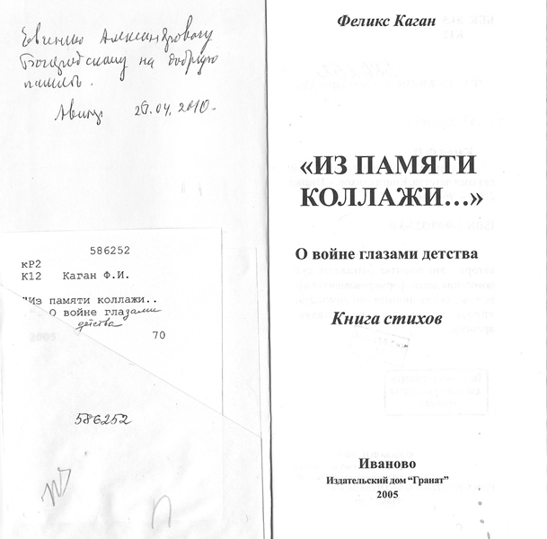 - Каган, Ф.И. «Из памяти коллажи…» : о войне глазами детства : книга стихов. – Иваново : Гранат, 2005. – 96 с. : ил.