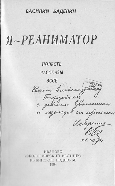 - Баделин, В.И. Я – реаниматор : повесть, рассказы, эссе / В.И. Баделин. – Иваново : Экологический вестник, 1994. – 351 с.