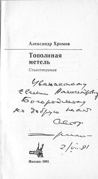 - Хромов, А.М. Тополиная метель : стихотворения / А.М. Хромов. – М. : Современник, 1981. – 94 с. – (Новинки «Современника»).