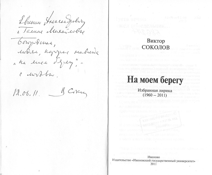 - Соколов, В. На моем берегу : избранная лирика (1960-2011) / В. Соколов. – Иваново : Ивановский гос. ун-т, 2011. – 160 с.
