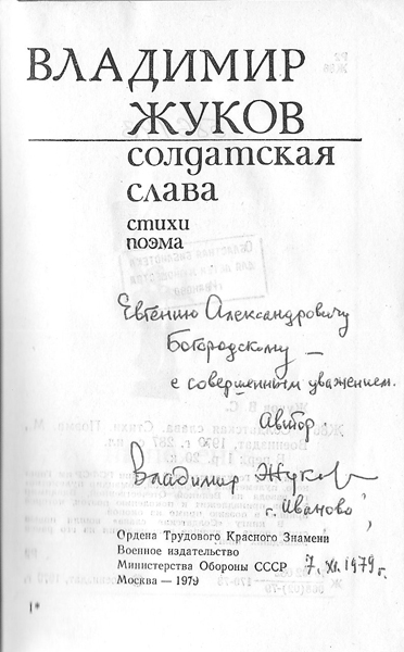 - Жуков, В.С. Солдатская слава : стихи, поэма / Владимир Семенович Жуков. – М. : Воениздат, 1979. – 287 с. : ил.
