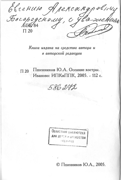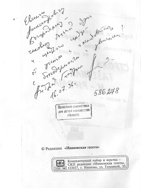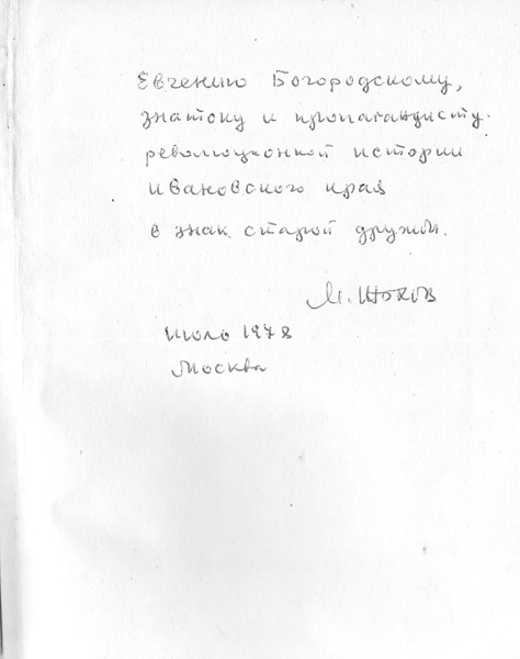 В завершении нашей работы хочется еще раз выразить глубокую и искреннюю благодарность Евгению Александровичу Богородскому за ценный подарок, который стал серьезным пополнением книжного собрания Ивановской областной библиотеки для детей и юношества и позволил нам продолжить исследовательский проект Фонд редкой книги представляет...» и его часть «Автографы заговорили».