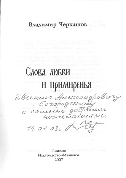 - Черкашов, В.В. Слова любви и примиренья / В.В. Черкашов. – Иваново : Иваново, 2007. – 132 с.