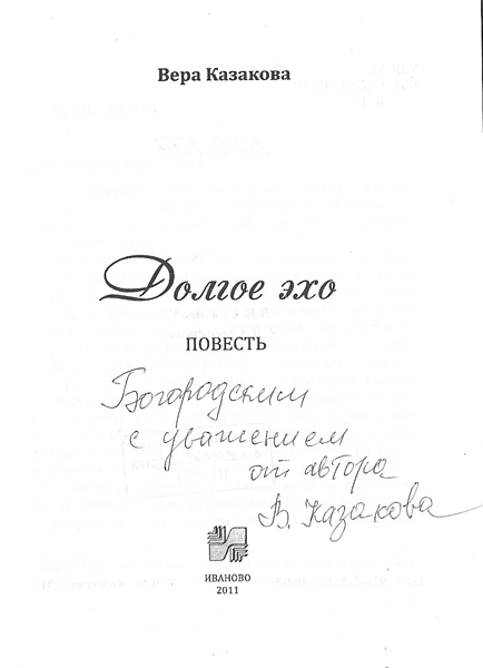- Казакова, В.М. Долгое эхо : повесть / В.М. Казакова. – Иваново : Иваново, 2011. – 158 с.