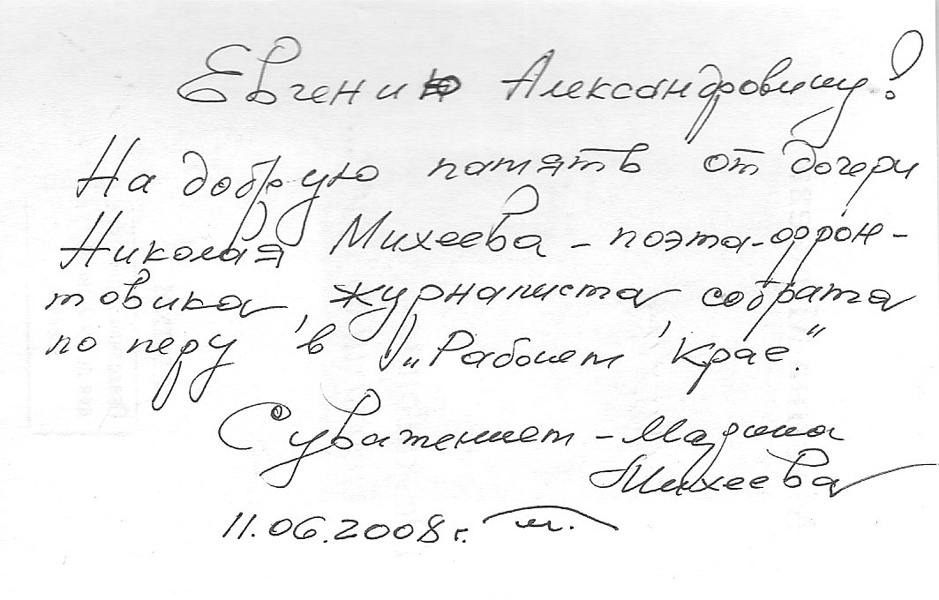 «Я хорошо помню Вас как отличного студента, увлеченного литературой. И я рад, что <...> свои знания и прекрасный вкус Вы получили возможность реализовать. Всегда с удовольствием читаю в «Раб. крае» Ваши обзоры литературно-художественных журналов. Обзоры емкие, с краткими, но точными характеристиками, позволяющие читателю ориентироваться в современной литературе.