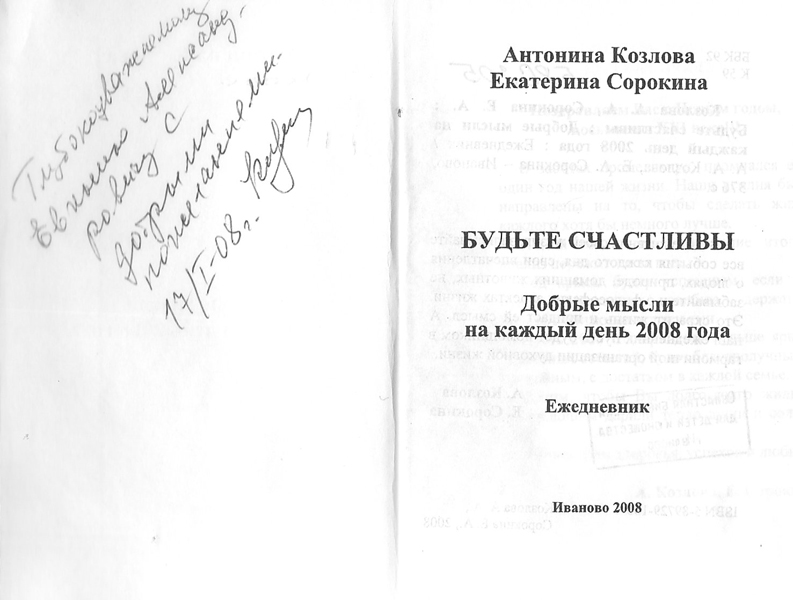 - Козлова, А.А. Будьте счастливы : добрые мысли на каждый день 2008 года : ежедневник / А.А. Козлова, Е.А. Сорокина. – Иваново : Иваново, 2008. – 367 с.