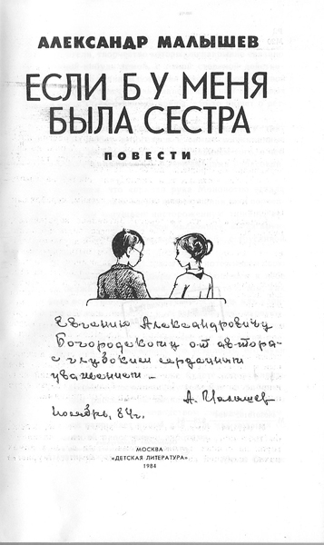 - Малышев, А.В. Если б у меня была сестра : повести / А.В. Малышев ; художник В. Брагинский. – М. : Детская литература, 1984. – 143 с. : ил.