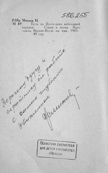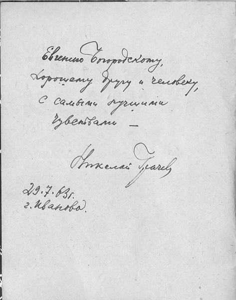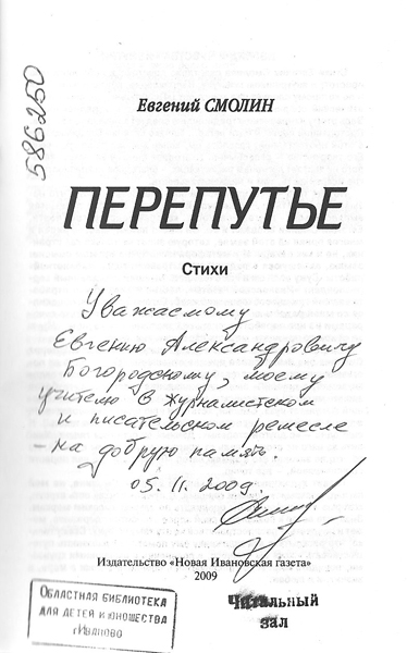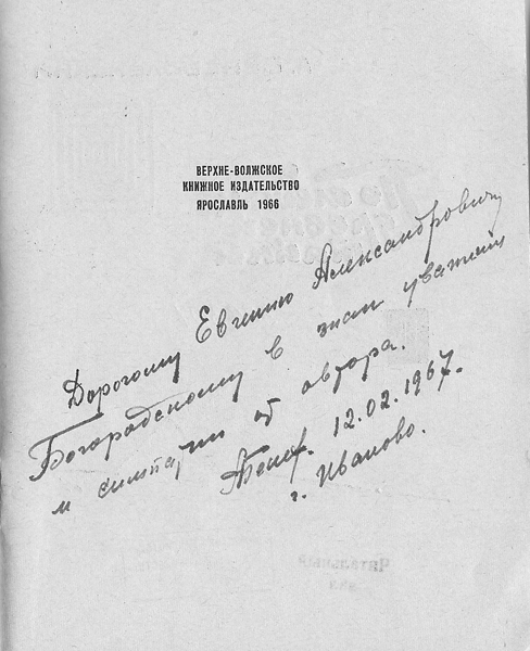 По этим автографам можно проследить характер и развитие взаимоотношений Евгения Александровича с авторами подаренных ему книг. С кем-то из них он начинал журналистскую деятельность, для кого-то был учителем и помощником, с кем-то из ивановских литераторов отношения из служебных со временем переросли в дружеские. А еще Е.А. Богородского называют наставником поэтов, первооткрывателем молодых дарований.