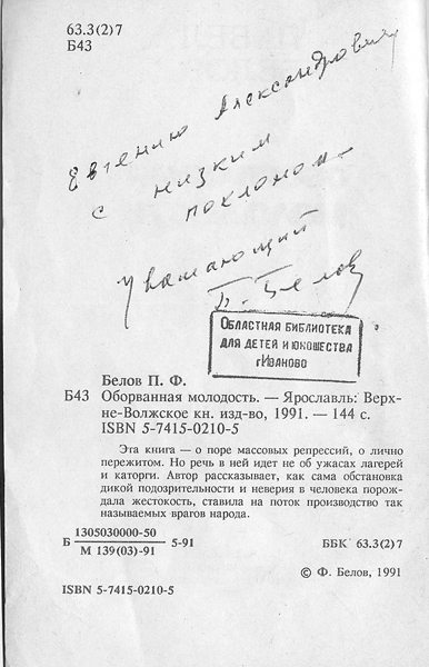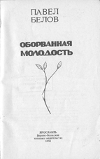 - Белов, П.Ф. Оборванная молодость / П.Ф. Белов. – Ярославль : Верхне-Волжское книжное издательство, 1991. – 144 с.