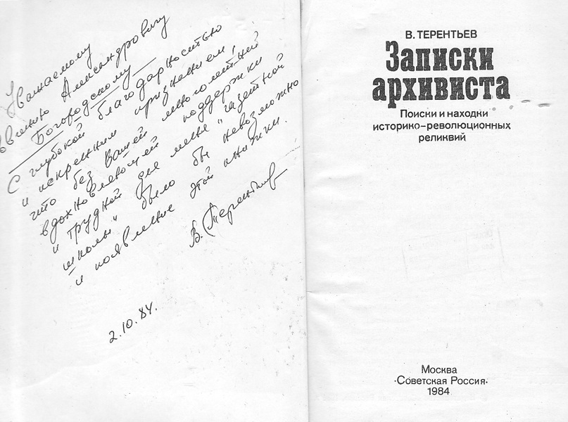 - Терентьев, В.П. Записки архивиста : поиски и находки историко-революционных реликвий / В.П. Терентьев. – М. : Советская Россия, 1984. – 208 с.