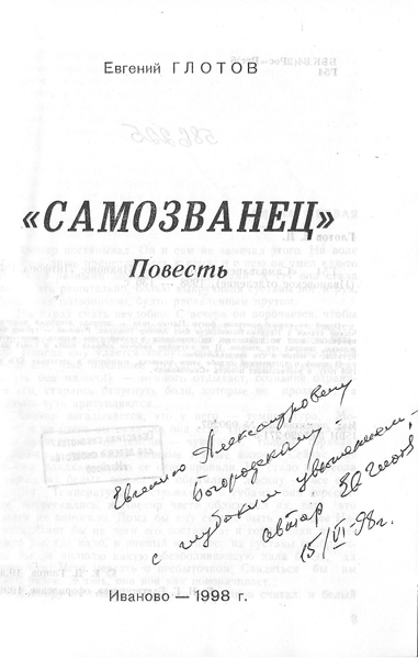 - Глотов, Е.Д. «Самозванец» : повесть / Е.Д. Глотов. – Иваново : Литфонд РФ, Ивановское отд-ние, 1998. – 136 с.