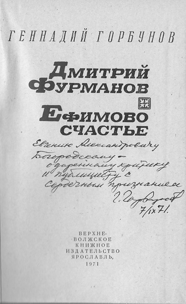 - Горбунов, Г.И. Дмитрий Фурманов ; Ефимово счастье : повести / Г.И. Горбунов. – Ярославль : Верхне-Волжское книжное издательство, 1971. – 172 с.