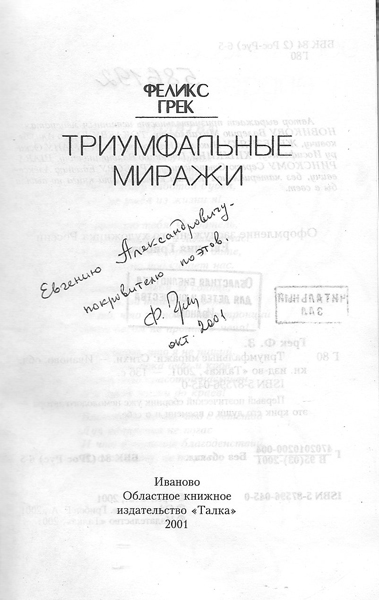 - Грек, Ф.З. Триумфальные миражи : стихи / Ф.З. Грек. – Иваново : Талка, 2001. – 136 с.