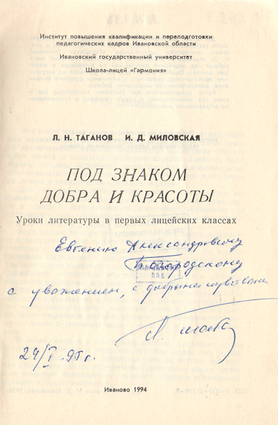 - Таганов, Л.Д. Под знаком добра и красоты : уроки литературы в первых лицейских классах / Л.Д. Таганов, И.Д. Миловская. – Иваново : Ивановский гос. ун-т, 1994. – 166 с.