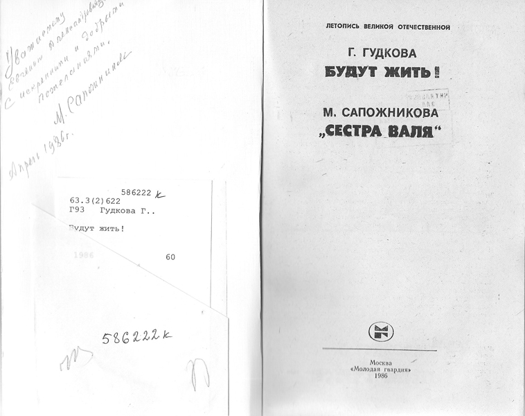 - Гудкова, Г.Д. Будут жить! : повесть / Г.Д. Гудкова. – М. : Молодая гвардия, 1986. – 317 с. : ил. – (Летопись Великой Отечественной).