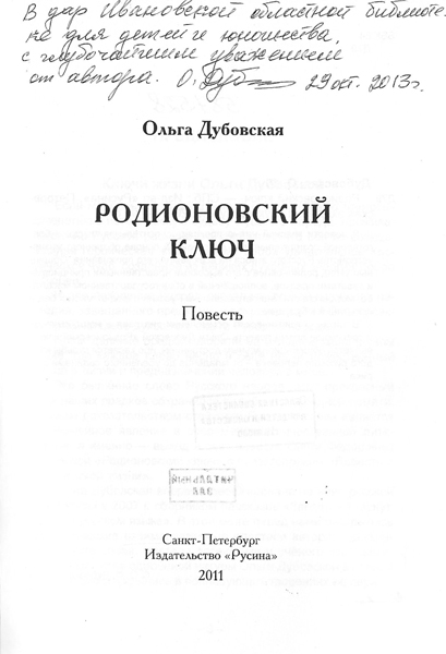 - Дубовская, О.Ф. Родионовский ключ : повесть / Ольга Федоровна Дубовская. – СПб. : Русина, 2011. – 100 с.