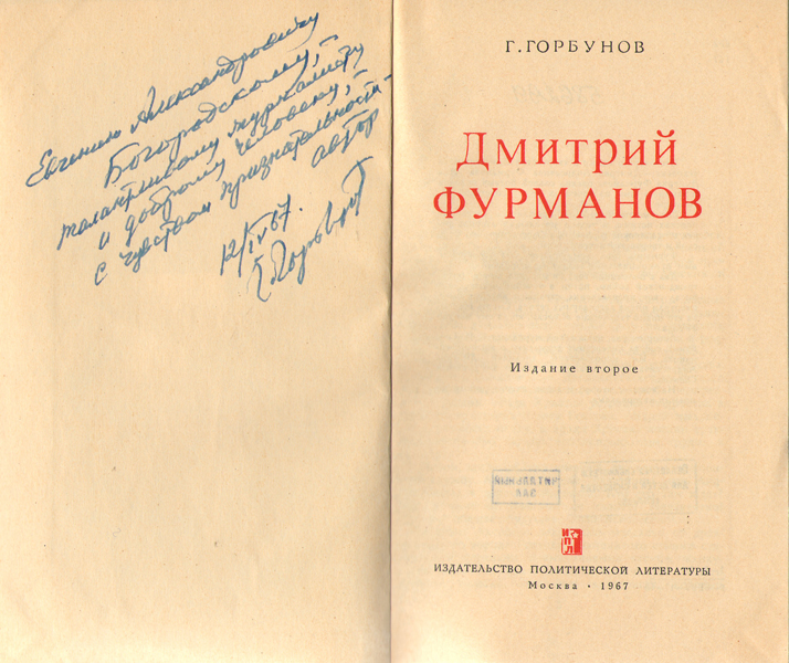 - Горбунов, Г.И. Дмитрий Фурманов / Г.И. Горбунов. – 2 изд., доп. – М. : Политиздат, 1967. – 175 с. : ил.