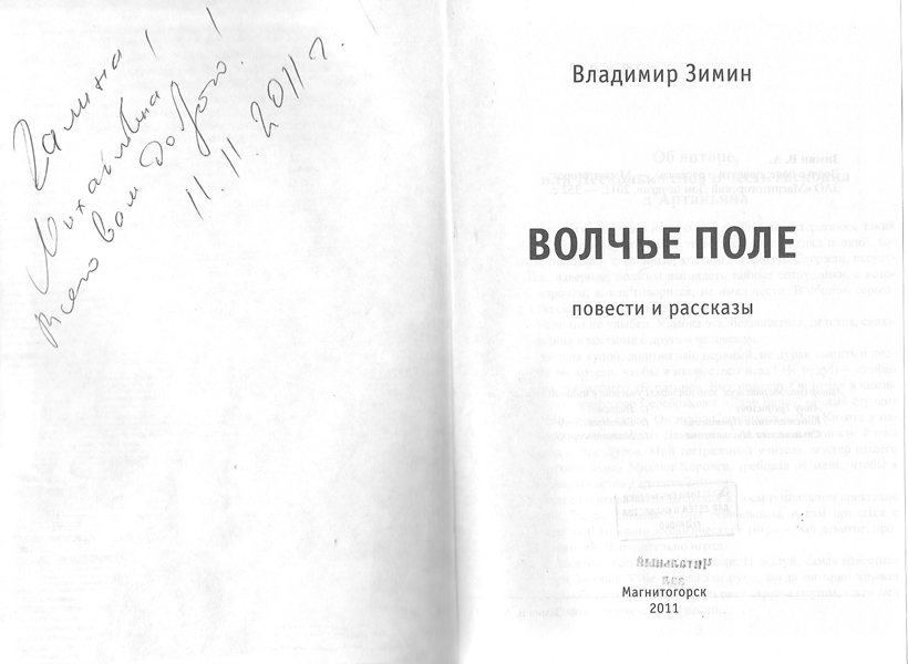 - Зимин, В.А. Волчье поле : повести и рассказы / В.А. Зимин. – Магнитогорск : Магнитогорский Дом печати, 2011. – 352 с.