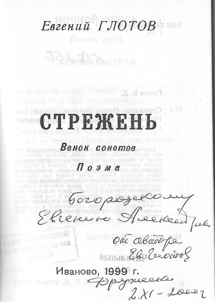 - Глотов, Е.Д. Стержень : венок сонетов, поэма / Е.Д. Глотов. – Иваново : Литфонд РФ, Ивановское отд-ние, 1999. – 88 с.