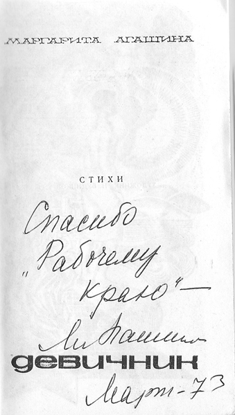 - Агашина, М.К. Девичник : стихи / М.К. Агашина. – Волгоград : Нижне-Волжское книжное издательство, 1972. – 127 с.