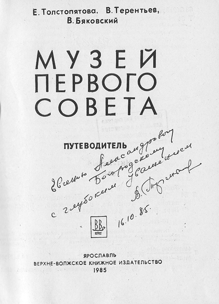- Толстопятова, Е.А. Музей первого Совета : путеводитель / Е. Толстопятова, В. Терентьев, В. Бяковский. – Ярославль : Верхне-Волжское книжное издательство, 1985. – 127 с.