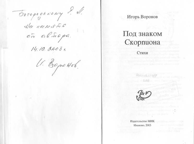 - Воронов, И.А. Под знаком Скорпиона : стихи / И.А. Воронов. – Иваново : МИК, 2003. – 95 с.