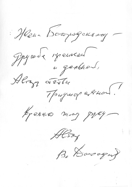 Многолетняя деятельность Е.А. Богородского в сфере культуры известна и за пределами Ивановской области. По этой причине, помимо краевых изданий, в коллекции автографированных книг, подаренных Евгением Александровичем нашей библиотеке, оказались и книги авторов из других регионов. С ними судьба сталкивала Богородского во время работы, творческих встреч и при других обстоятельствах. В дарственных надписях на этих изданиях все также звучит глубокое уважение к Евгению Александровичу.