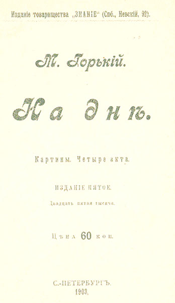 - Горький, М. На дне / Максим Горький. – СПб. : Издание товарищества «Знание», 1903. – 166 с.