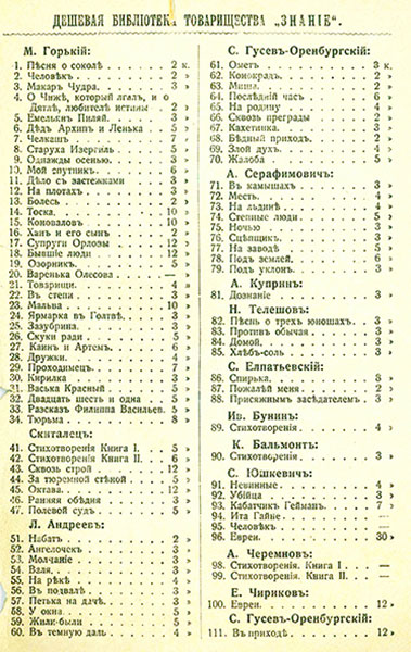 В фонде нашей библиотеки хранится книга, изданная товариществом «Знание». Это – пьеса М. Горького «На дне». Книга, к сожалению, сильно потрепана, корешок мягкой обложки порван, но на ее обороте мы находим репертуар изданий «Дешевой серии» с указанием их стоимости.