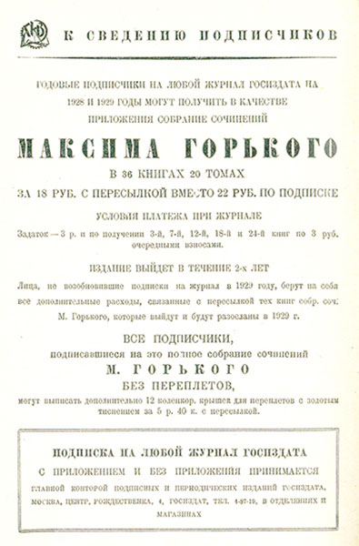 На последующих изданиях собраний сочинений Максима Горького мы находим пометку, что «печатается по тексту берлинского издания». Примером может служить собрание сочинений писателя, выпущенное в 1928-1930 годы Государственным издательством. В предисловии читаем: «Сочинения М. Горького печатаются по тексту проредактированного автором берлинского издания 1923 года с исправлениями по рукописям и предшествующим публикациям». Непосредственного участия в подготовке и выпуске этих изданий автор не принимал. Тем не менее, сверить с ним публикуемые тексты было необходимо: редактор изданий И.Л. Груздев консультировался с автором. В фонде ИОБДЮ это собрание сочинений представлено почти полностью.