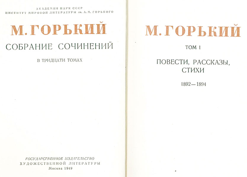 - Горький, М. Собрание сочинений / Максим Горький. – Т. I-VI, VIII, XI, XIII-XIV, XVII. – М.-Л. : Государственное издательство, 1927; Т. IX, XV-XVI. – Л. : Государственное издательство, 1924; Т. X. – М.-П. : Государственное издательство, 1924.