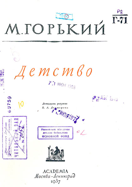 - Горький, М. Детство / Максим Горький ; ил. Б. А. Дехтерев. – М.-Л. : ACADEMIA, 1937. – 168 с. : ил.