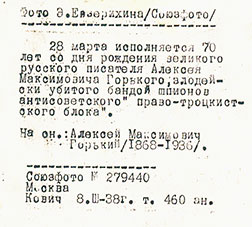 Через всю жизнь Горького прошли фотографии и люди, связанные с фотоискусством. Большая часть фотографий Алексея Максимовича хранится в фондах Русского музея фотографии. В фонд ИОБДЮ поступили несколько уникальных снимков писателя. Эти фотографии были сделаны при жизни М. Горького разными авторами, и, по-видимому, в 1938 году, к 70-летию писателя, рассылались подборкой в редакции местных газет Агентством «Фотохроника ТАСС» для опубликования. Снимки восьмидесятилетней давности, а особенно этикетаж (подписи) к ним, характерный для сталинского времени, ярко отражают общую идеологическую атмосферу той сложной и неоднозначной эпохи.