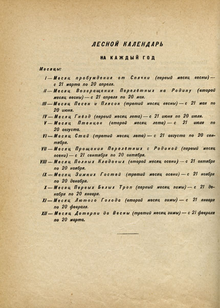 В день весеннего равноденствия – 21 марта – в природе происходит поворот к весне. С этого числа и начинается (по «Лесной газете») новый лесной год. В нем, как в человеческом календаре, – двенадцать месяцев. Каждому из них посвящен в газете отдельный номер. Двенадцать месяцев лесного года составляют двенадцать номеров лесного календаря. Чем наполнены они в книге? Из огромного пестрого потока быстро сменяющихся сезонных явлений природы, В. Бианки отбирает в каждый номер только самое главное и яркое. Он улавливает характерную черту каждого лесного месяца и выражает его точным и образным названием: «Месяц пробуждения от спячки», «Месяц прощания перелетных с Родиной», «Месяц первых белых троп», «Месяц лютого голода», «Месяц дотерпи до весны» и так далее.